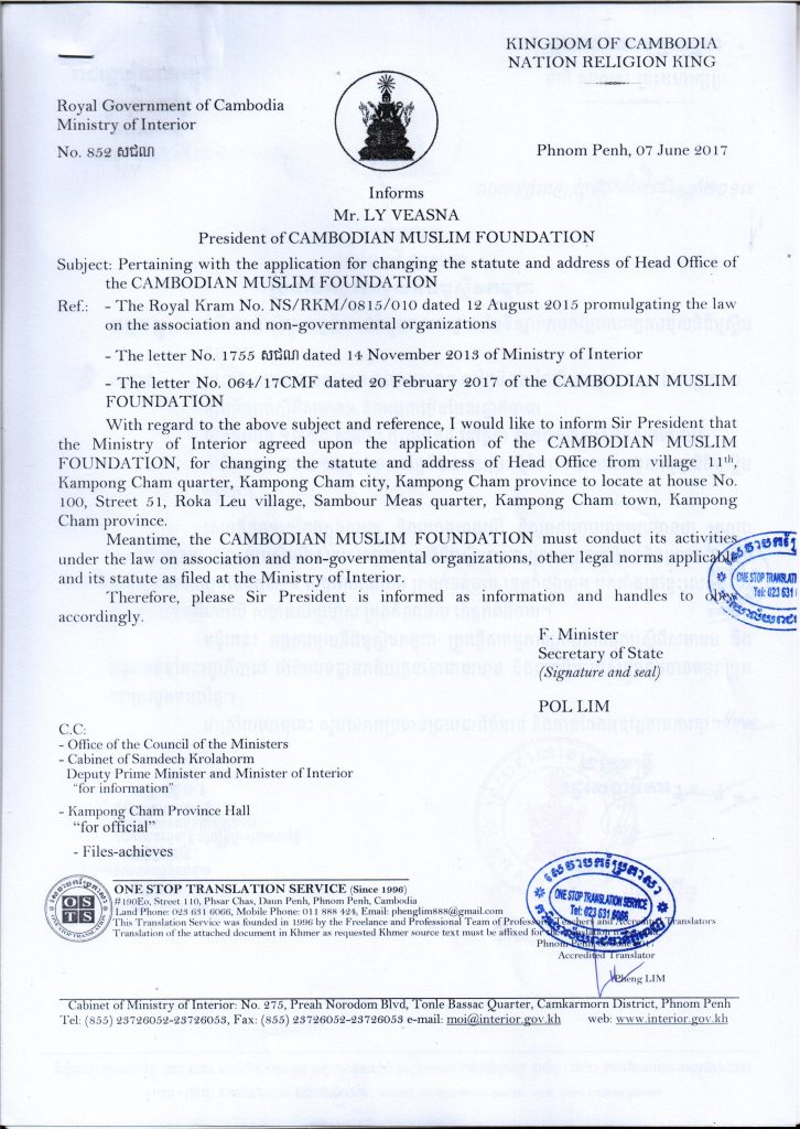 Approval to new address issued by The Royal Government of Cambodia Ministry of Interior 7 June 2017